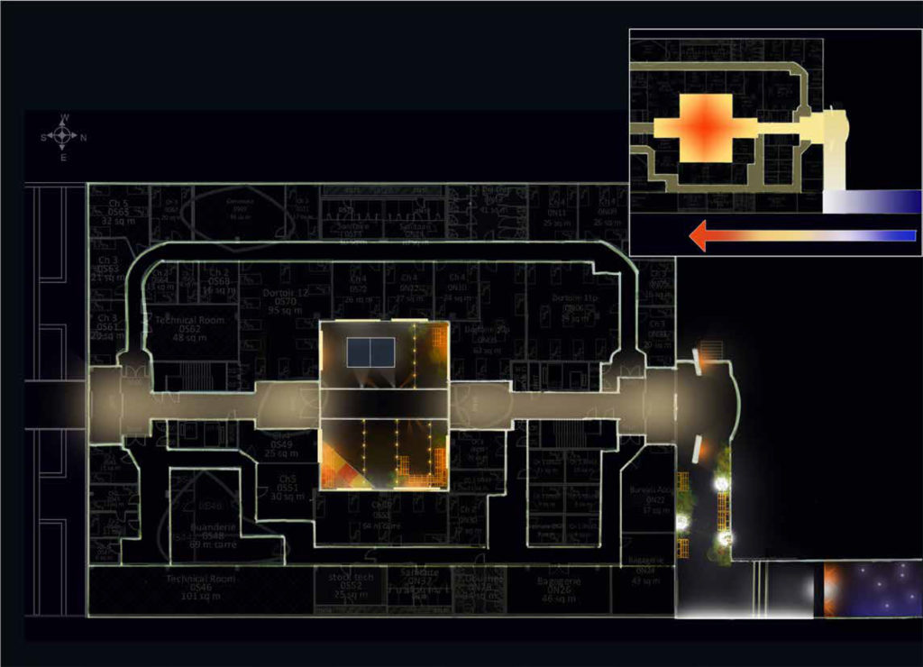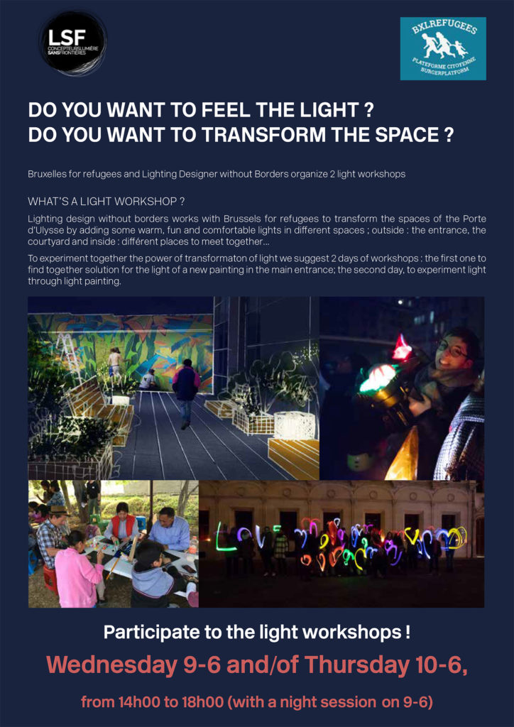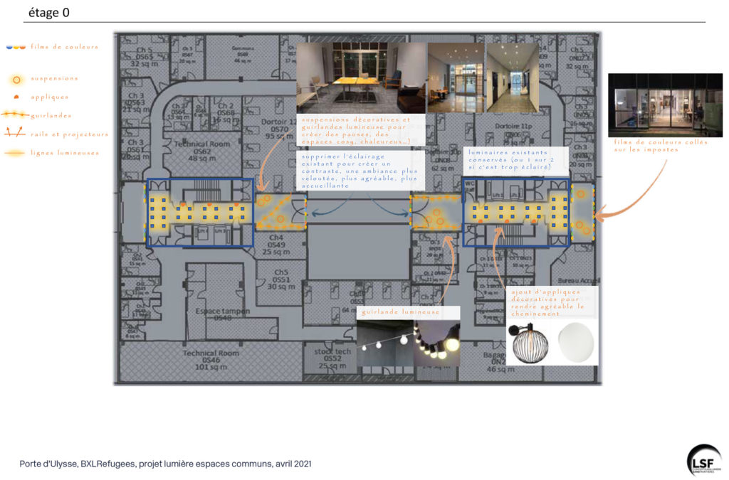 Le bâtiment, transformé en centre d’accueil (provisoire / semi permanent), était auparavant le siège de Canal +. L’association des Concepteurs Lumière sans Frontières a répondu à un appel à bénévoles de Brussels for Refugees afin de proposer des solutions d’éclairage pour rendre les espaces communs plus chaleureux.